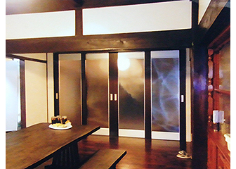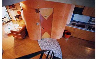 曲線の壁に、その壁に合せたカーブドアーを取付けました。キッチンと応接コーナーを分ける役割も果たしています。無垢のサクラのフローリングやイタリアンスタッコの壁面がナチュラルでプロバンス風の雰囲気をかもし出しています。