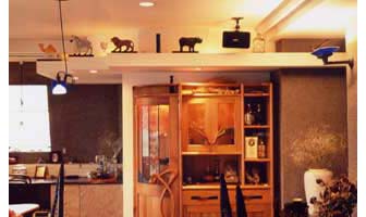 クルミの木で作ったコーナーが大きい食器棚の上部に、飾り棚を兼ねた大きな棚を設置しました。背面より間接照明で照らす事により、浮かび上がったように見えます。暖かい雰囲気が出るように照明は全て白熱灯にしました。