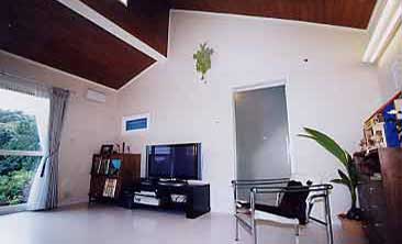 平家建てのリフォームで、天井を取払い屋根の勾配に合せた天井にしました。木目の天井にし、壁を白色に塗装。床も茶色のフローリングでコントラストの強い室内に仕上げました。採光と風の流れを工夫して住み心地の良さも追求しました。