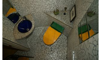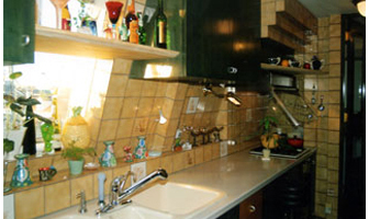 斜め壁面のスカイライトから光がふり注ぐキッチンです。スペイン製のタイル、フランス製のガラスフード、アメリカ製のホーローシンクを集めてきて、全てが楽しいキッチンスペースとなりました。