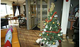 扉も家具屋さんに作ってもらい、モスグリーンの梁木仕上げとしました。光を通して輝くグラスやコップは、一つづつ気に入ったものを集めてきたものだそうです。ファブリックを変えると楽しい住まいを演出する事が出来ます。今回はクリスマスツリーを飾り付けてみました。