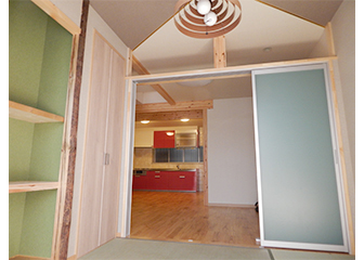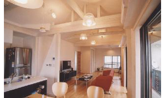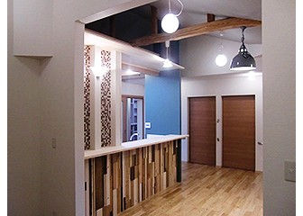 以前はご主人御兄弟の使う子供部屋が並んでいた2階。結婚されて独立していましたが、2階をお若いご夫婦の生活スペースとして玄関を共通に使うタイプの2世帯に変更しました。増築も行なった結果、広いリビングルームが完成しました。対面キッチンは、I型キッチンを利用して、対面側を当社で造作しました。吹抜けやロフトのある大空間に家族が集います。