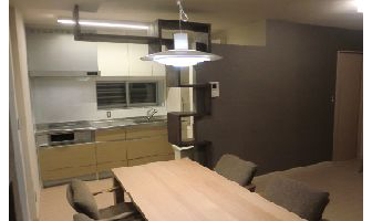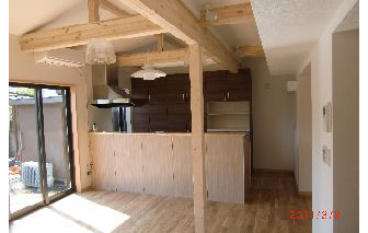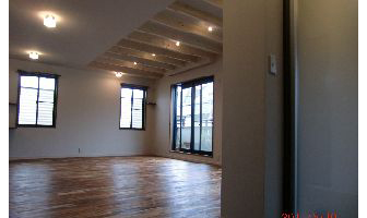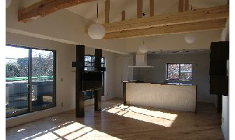 築50年のRC造の長屋2階建てで、狭くて天井も低く、冬は寒いのが悩み。独立されたお子様ご家族が遊びにこられた時にくつろげる広いリビングが欲しいとリフォームしました。RC造と一部増築歴のある木造の混構造のため、構造的に撤去できない壁が数多くあり、26・あるLDK内には柱を1本しか出さないように太い化粧梁を使い「広々リビング」を実現しました。