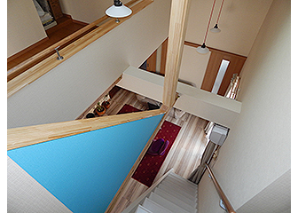 木の香りがする、吹抜けのある気持ちの良い空間です。自然光がふりそそぐ、採光と通風共に気持ちのよい空間となりました。壁には珪藻土を塗って、よりナチュラルな空間です。ロハスな意識を空間に取り入れました。