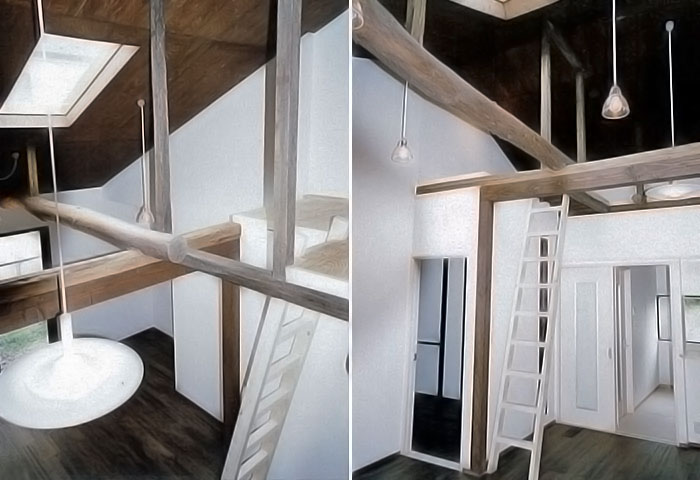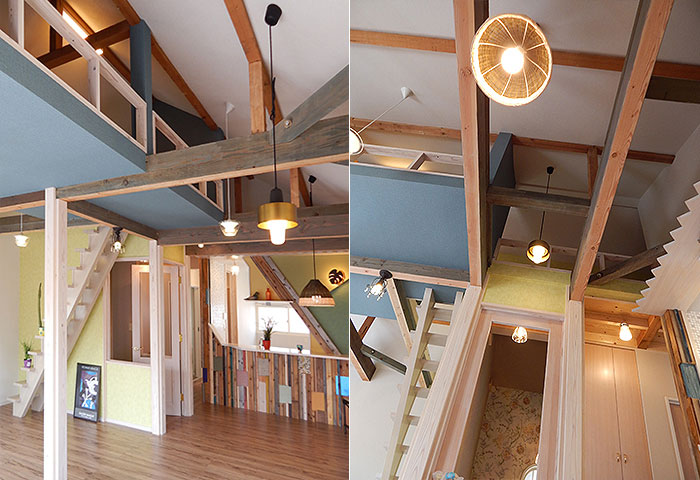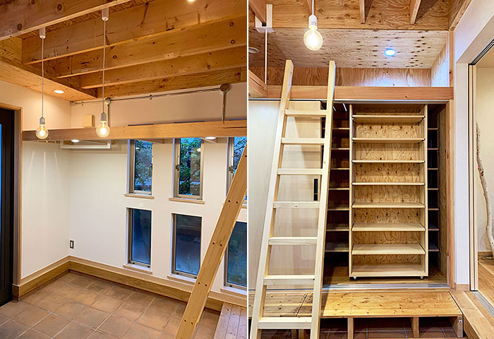 (左)天井の構造材を露出させ、ウッディな雰囲気にしました。(右)梯子で登るロフトの下には移動式の収納の箱を設置しました。ローコストで素晴らしい「棲みか」になります。