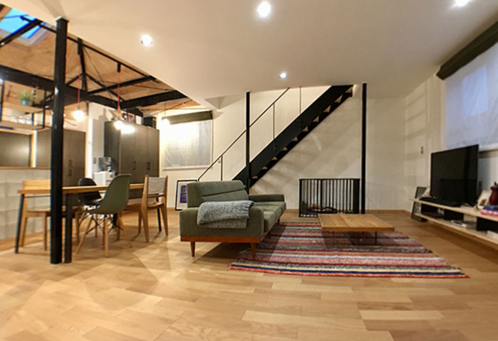 鉄骨梁がアクセントカラーとなった吹抜けのあるLDKは、リフォームによりシックで統一感がある空間に