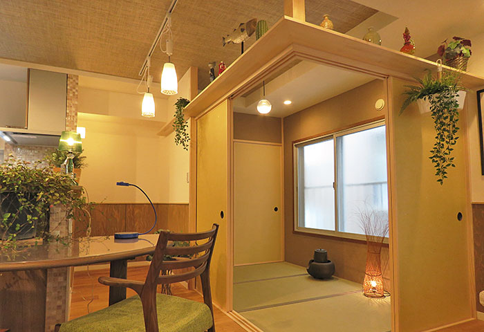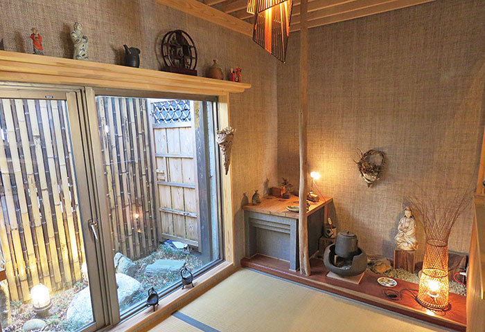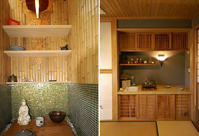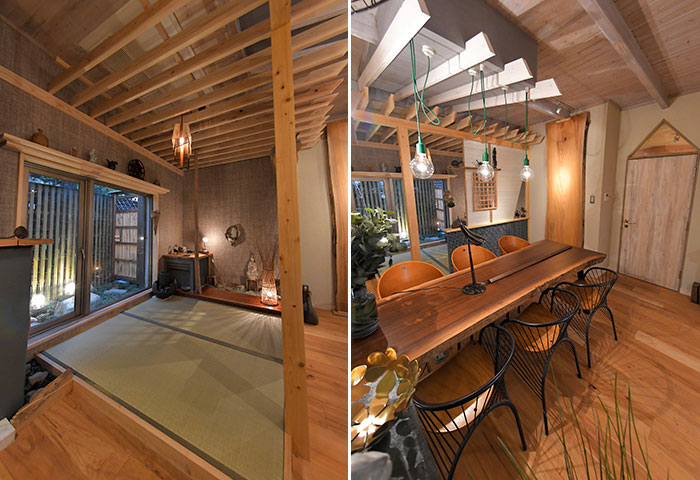 (右)千利休の待庵と同じ2帖の茶室と坪庭を作りました (左)ダイニング奥にこだわりの茶室を作りました