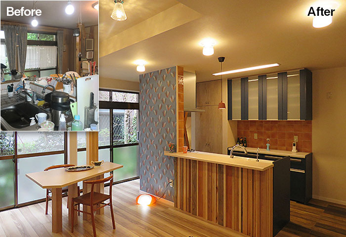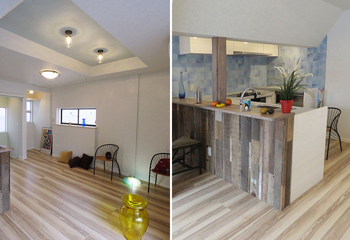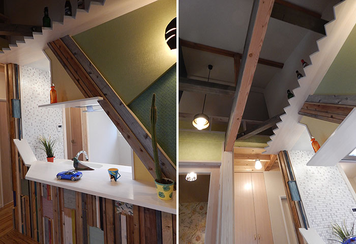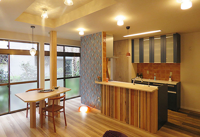 キッチンカウンター周辺の腰壁は解体時の木材を利用してカラフルにしました。ギザギザな飾り棚が不思議な雰囲気を醸し出しています。自分だけのオリジナルな空間を作りましょう。