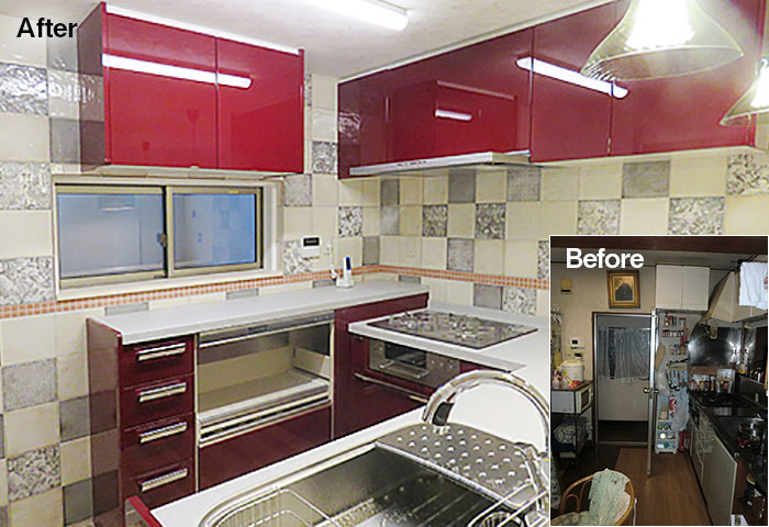 (左)L型キッチンの床には白の大理石を貼りました(右)壁面収納はたっぷり作りました。
