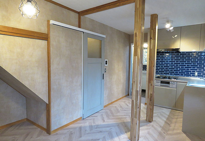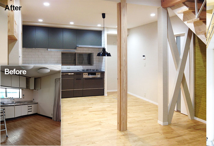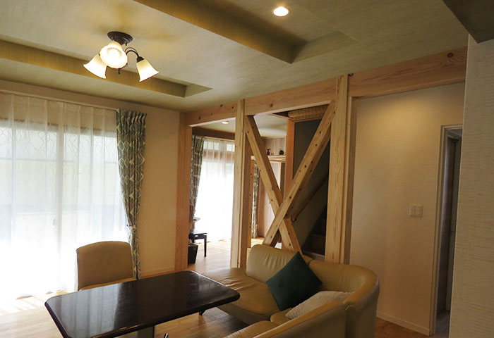 廊下部分を撤去して、リビングを広げ、化粧柱・梁・筋違いで構造を補強しました