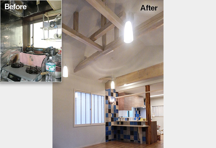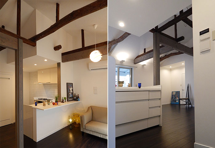 小屋裏の梁を白く塗ってモダンに仕上げました。北側にあったキッチンを対面式にしました。