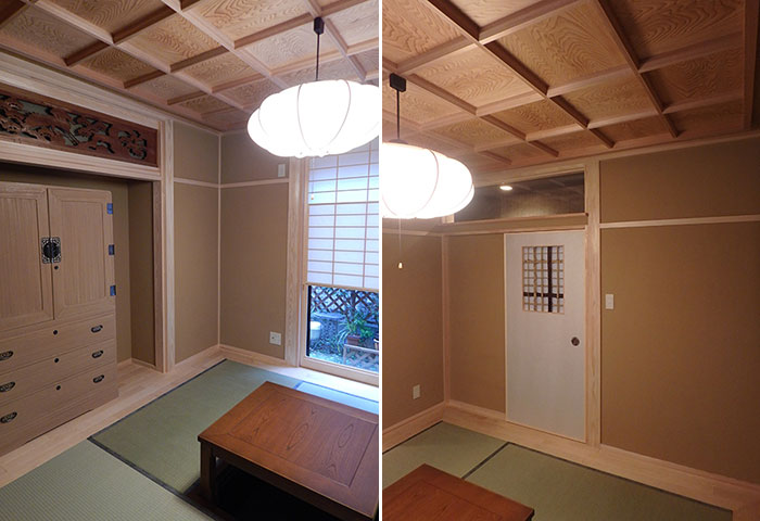 (左)格天井を組んだ和室。欄間は奥様の実家を解体した時の物。(右)出入口戸に下地窓を取り付けました