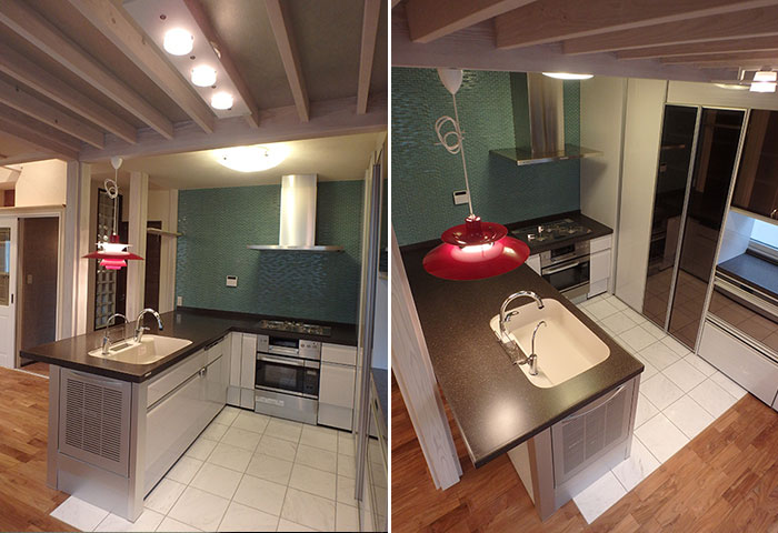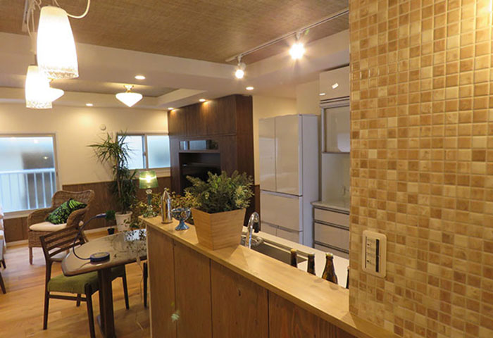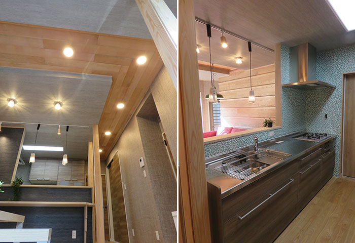 (左)リビングの折り上げ天井・ガラス照明が上品な雰囲気を作り出しました。(右)木材とブルーのタイルが相性の良いキッチン