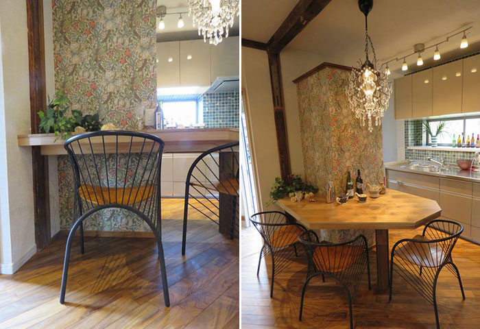 (左)壁クロスはモーリスデザイン。シャンデリアはイケア(右)キッチン脇にダイニングテーブルを造作しました。