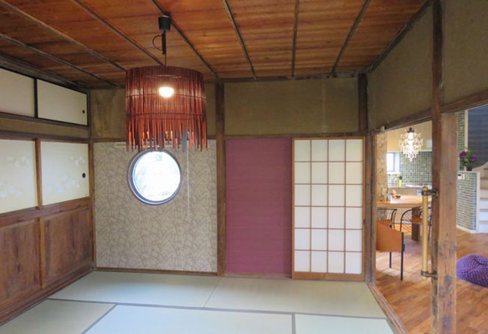 築60年の和室に丸窓を取り付け照明器具は作りアクセントに壁紙を貼りました。