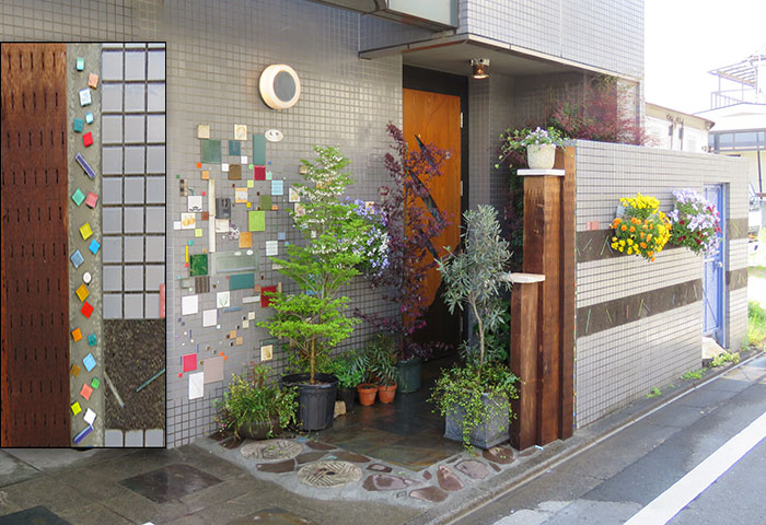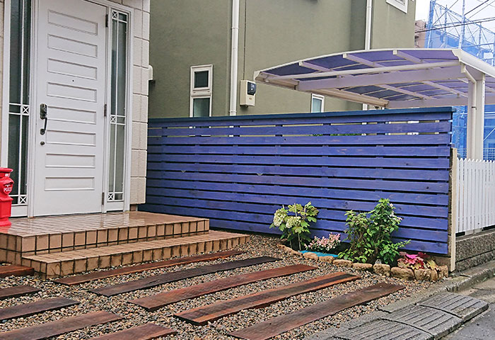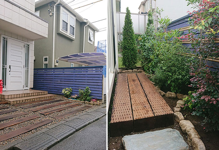 駐車場の入口を広くしたついでに玄関前に枕木を建て植栽をしました。様々なタイルを貼ってアクセントに