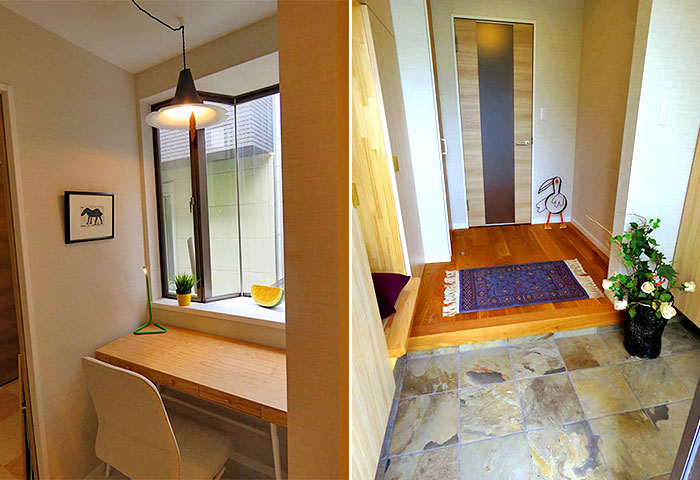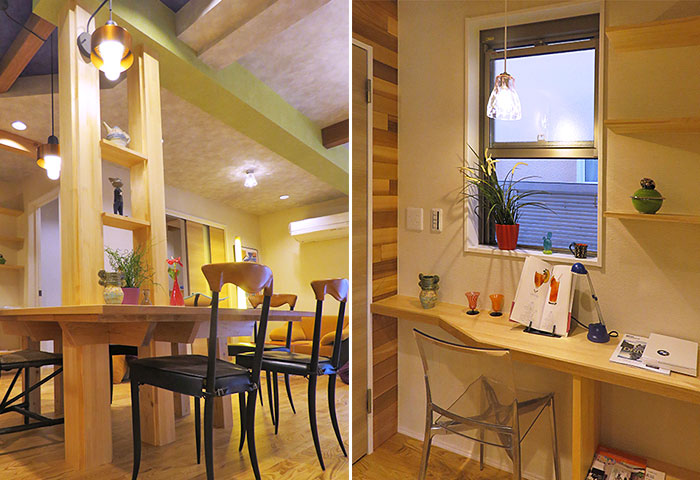 (左)柱と梁を構造補強して美しくデザインしました。(右)窓際のちょっとした造作机はとても便利です。