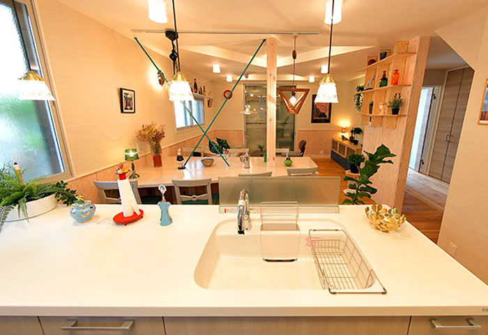 L型キッチンから見る造り付ジャイアントテーブルとリビング。ヘーベルハウスの改造例です。