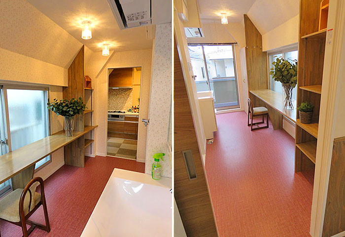 (左)ダイニングとユーティリティ。築50年のアパートのリノベーション(右)リモートワーク用のデスクとキッチン