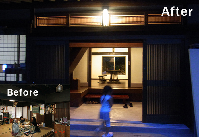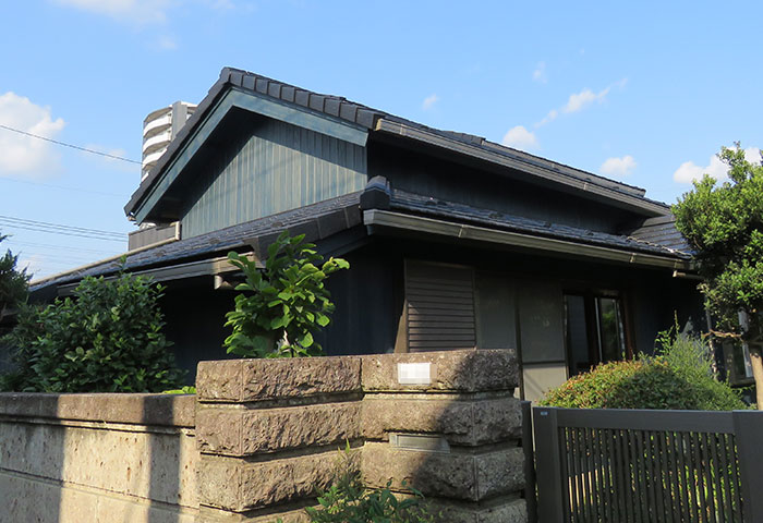風格のある土壁を藍色の板張にして屋根を葺き替えた