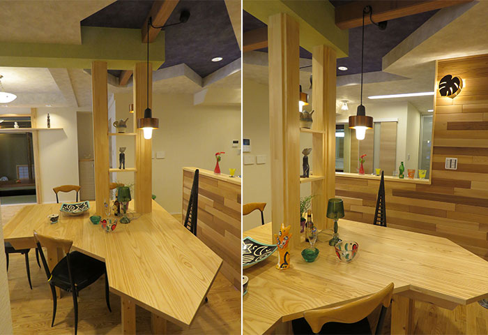 構造補強した柱を挟んでご夫妻用のダイニングテーブルを造作しました
