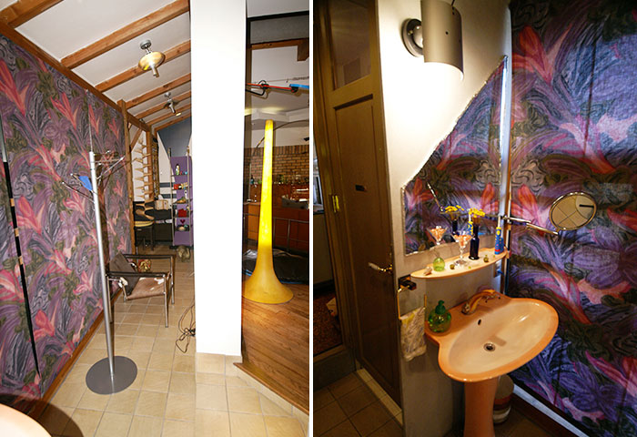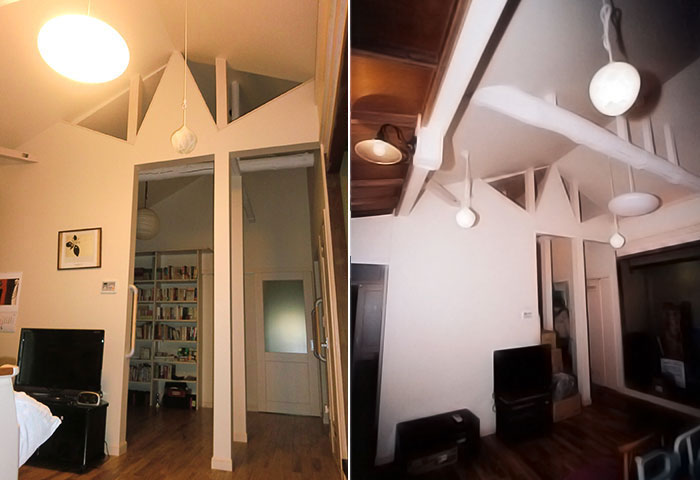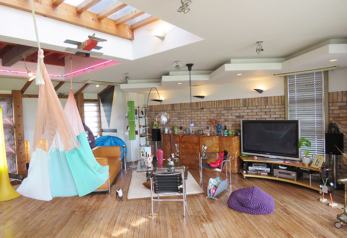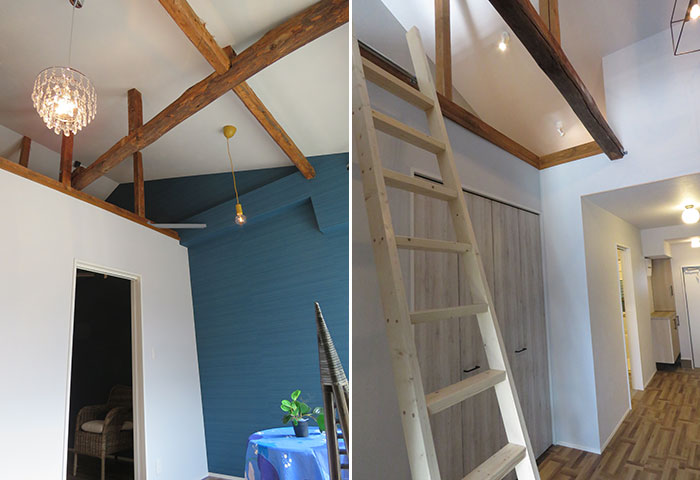 (左)築50年のアパートのリノベーション。シャンデリアを付けました(右)ロフトに梯子で登ります。