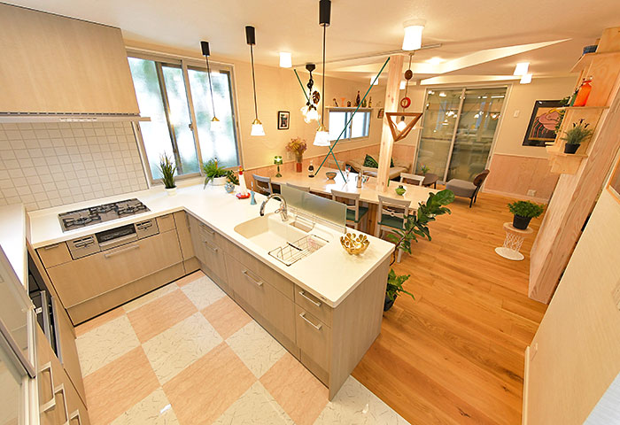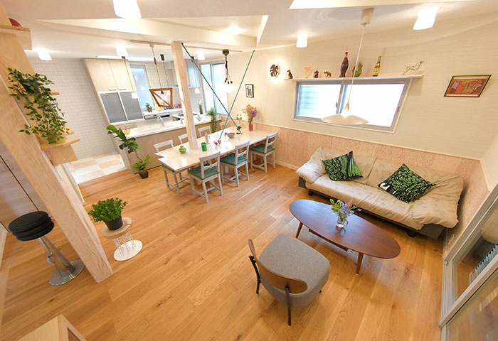吹き抜けのある2階リビングダイニングキッチン。構造梁を化粧梁とすることで開放的な吹抜け空間が実現しました。天然木材の無垢材を使用したことで、ナチュラルなインテリアになりました。