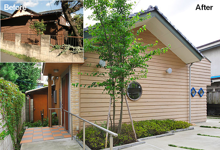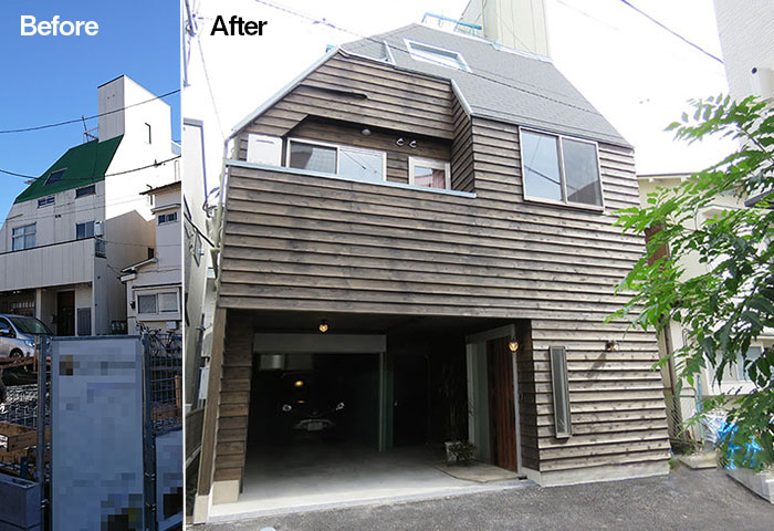 (左)無機的な垂直のビルのような外観 (右)バルコニー部分を広げて右半分は増築して部屋に。外観は杉板を張った暖かい雰囲気の家になりました。