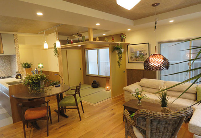 リビングのコーナーに小さな和室を造りました。 建具を全て開放すれば小さな和室としても使えます。