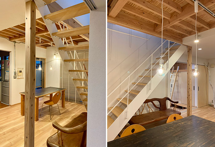 (左)鉄骨フレームのストリップ階段に架け替えを (右)リビングは木部を多用する事で、壁や床で仕切られても圧迫感の少ない空間に仕上げる事が出来ました。