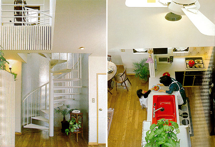 (左)3階に上がる螺旋階段を取り付けました(右)吹抜けからキッチンを見る