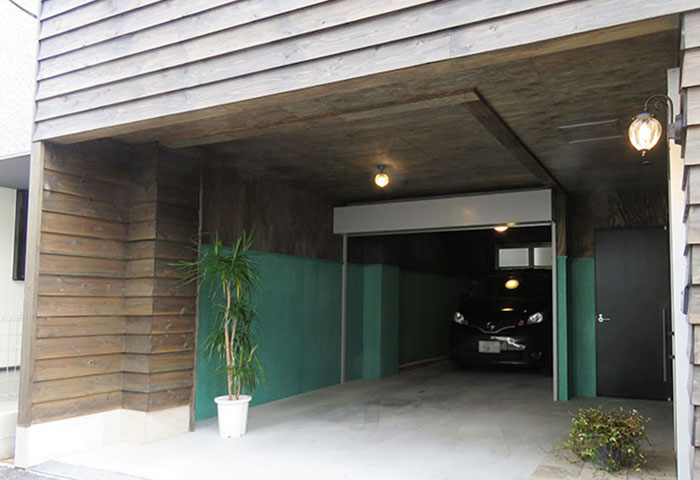 車庫にも自然素材を使用して、一部鮮やかなグリーンにしました