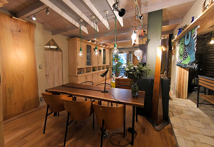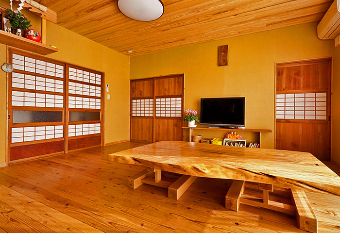 自然素材をふんだんに使用したリビング。家具などのインテリアも当社で担当しました。