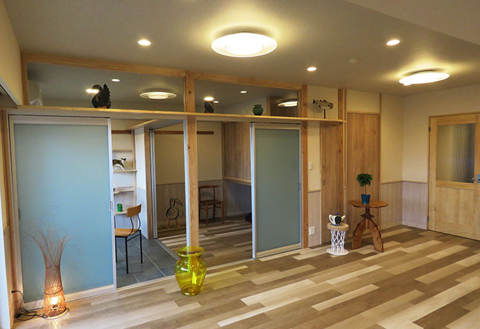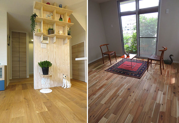 (左)玄関とリビングを仕切った板貼の壁と飾り棚(右)高齢のお父様の部屋に貼ったアカシアの無垢のフローリング