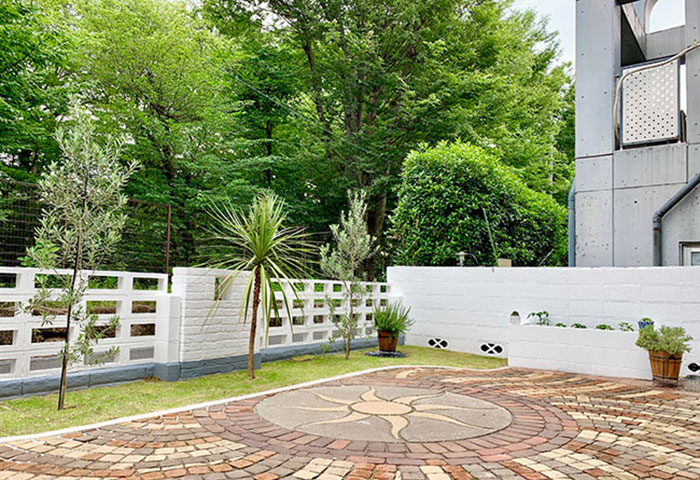 穴あき化粧ブロック塀とタイルで絵を描いたテラス