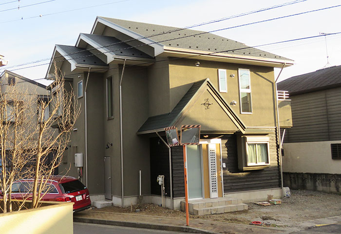 急勾配の幾層にも重なる軒の深い屋根とダークグレーの外観は、日本の古い民家を思わせます。