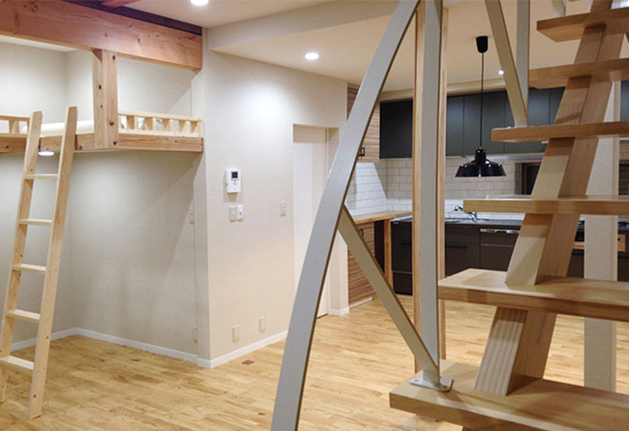 新たに作った木製階段の奥にキッチン。左側には子供達が遊ぶため、上吊りのL型のスペースを作りました。