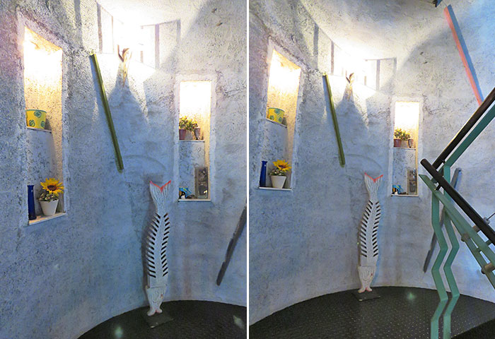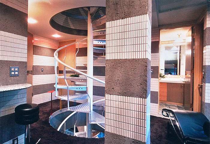 家の中にある螺旋階段は家全体の空気を入れ替える煙突の役割があります。モザイクタイル貼りとモルタル掻き落とし仕上げで永遠に美しい。