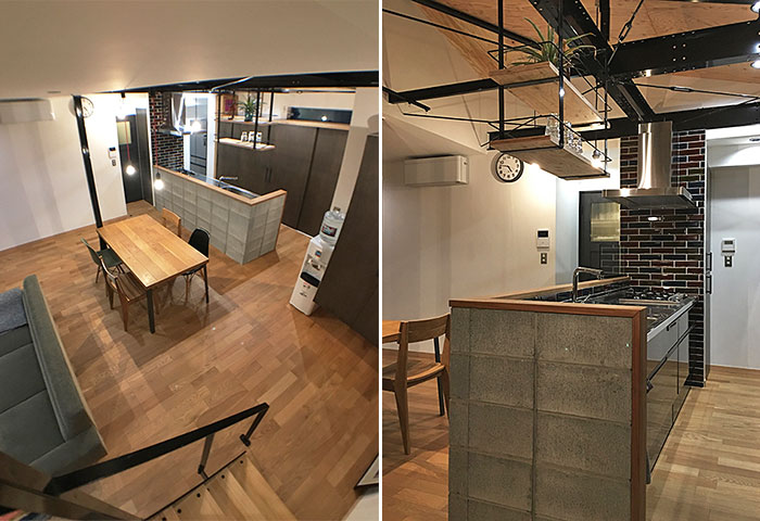 (左)ソーホー風のデザインのLDK。(右)化粧コンクリートブロックの壁と鉄骨むき出しの天井。