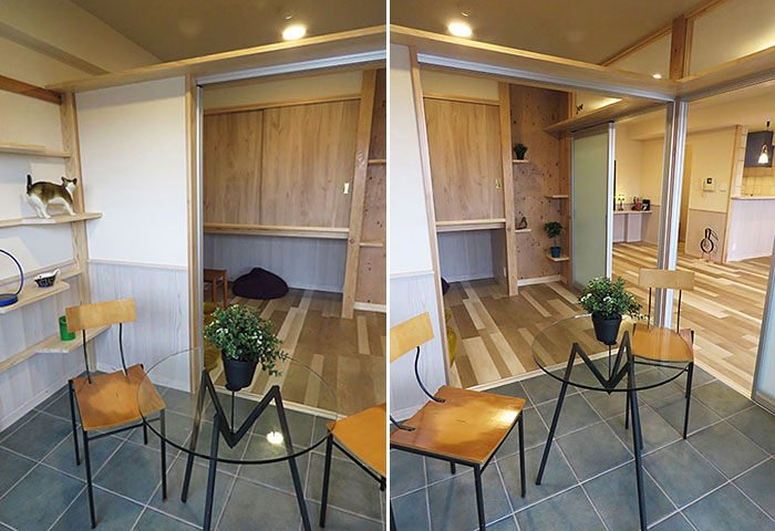 室内にオープンテラスを作り、ご夫妻と猫のための部屋を作りました。キャットタワーとキャットウォークで猫にとっては嬉しい空間となりました。
