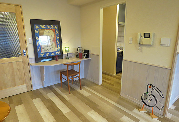 キッチン脇リビングの一角に主婦用の専用デスクを造作しました。あちこちで買ってきた小物を並べるのも楽しい。
