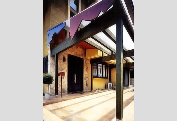 アルミ製の既製品のガレージではなく骨太の材木とポリカーボネートの屋根にして、正面には遊び心のあるカラフルなプレートを取り付けました。毎日玄関ドアを開けるのが楽しくなります。