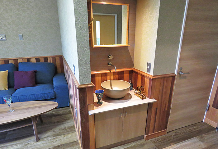 高齢者に便利なように、リビングの一角に洗面台を設置、その脇にトイレを造りました。老後はシンプルで楽しく過ごしたいです。