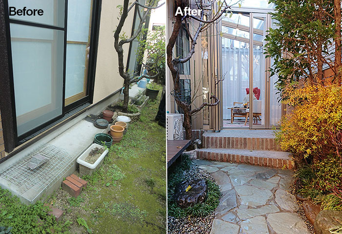 殺風景だった庭に全面ガラスのオープンテラスを作りまくりました。植栽は日常生活の癒しとなります。