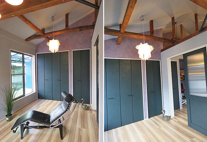 (左)化粧梁が露出した寝室(右)ダークグリーンの建具で統一しました