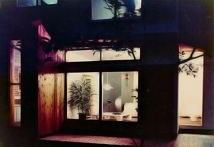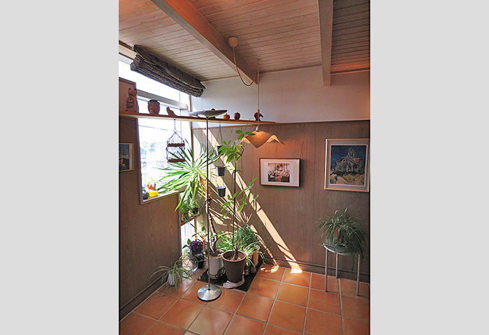窓際の演出。床は素焼きタイル。壁はタモベニヤ塗装。天井はパイン材。三角に掛けた飾り棚がアクセントになっている。