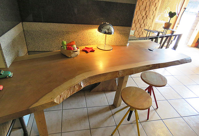 変形した栃の無垢のカウンター材を壁のコーナーに取り付けました。