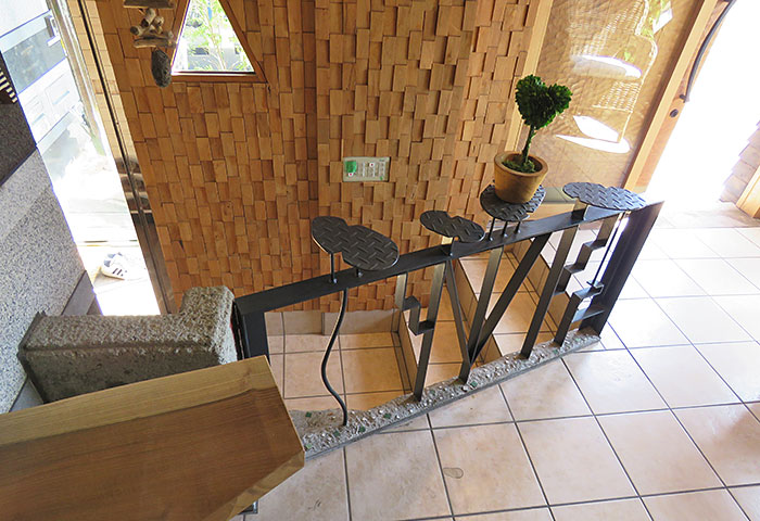 様々な鉄の部材を加工して作った飾り棚と手すり。