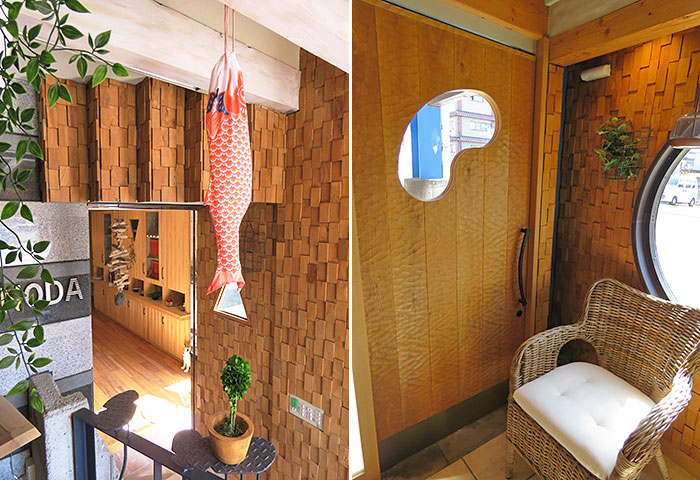 (左)ウッディな壁に似合う鯉のぼりのオブジェ(右)ひょうたん型のガラスが入った木製玄関ドア