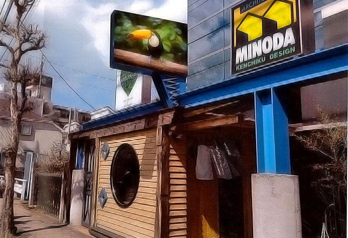 電子機器会社の外装リノベーション。濃紺と緑色のツートーンといて街のランドマークとしました